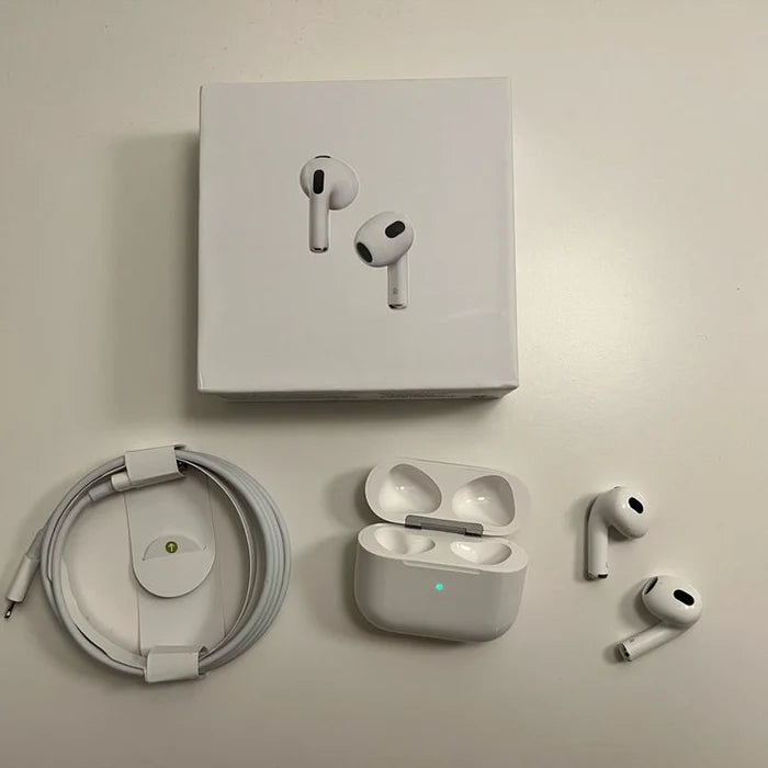 AirPods 3 предлагат напълно нов контурен дизайн с 33% по-късо стъбло и сензор за сила за лесно управление. Те осигуряват комфорт и прецизно насочване на звука към ухото.
